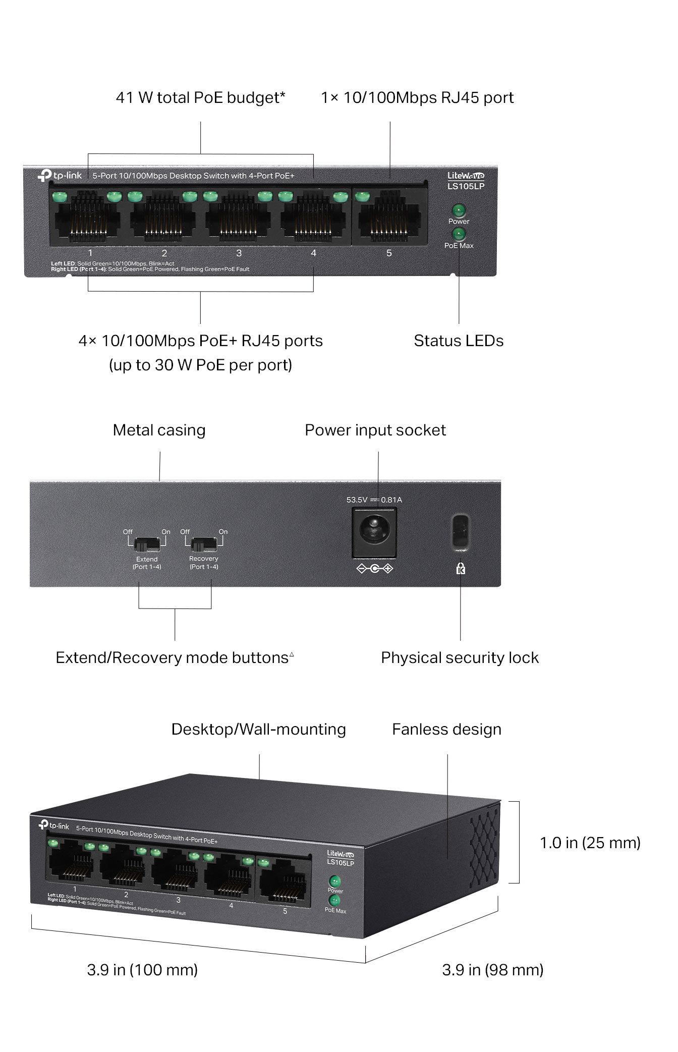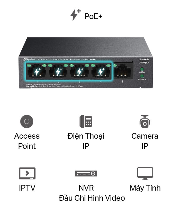 - 4× cổng 10/100 Mbps PoE+ với đầu ra PoE lên tới 30 W trên mỗi cổng*