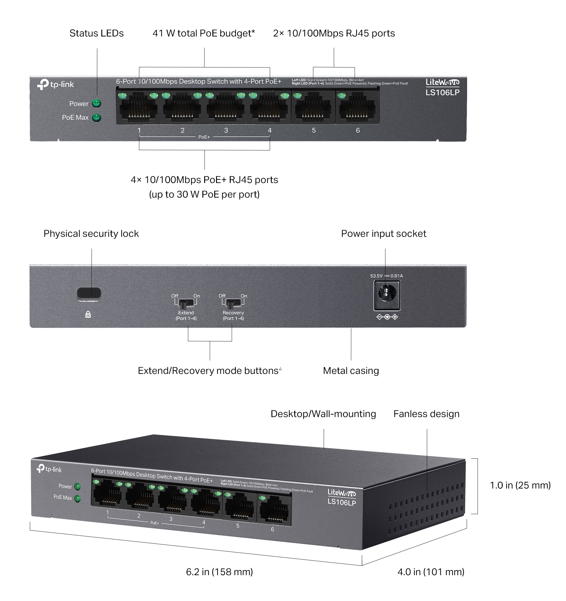 - Công Suất PoE 41 W: Bốn cổng PoE 10/100 Mbps tương thích 802.3af dễ dàng kết nối và cấp nguồn cho các thiết bị cố định như camera IP, access point và điện thoại IP thông qua một cáp duy nhất. Đầu ra PoE lên tới 15,4 W được hỗ trợ bởi mỗi cổng PoE.*