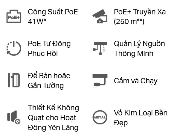 Tuân thủ các tiêu chuẩn IEEE 802.3af/at PoE, switch hỗ trợ tổng công suất PoE là 41 W và tối đa 30 W trên mỗi cổng PoE+. Khi tổng mức tiêu thụ điện năng vượt quá 41 W, tính năng quản lý nguồn điện thông minh sẽ cắt nguồn điện của các cổng có mức ưu tiên thấp hơn để bảo vệ thiết bị khỏi bị hư hỏng.