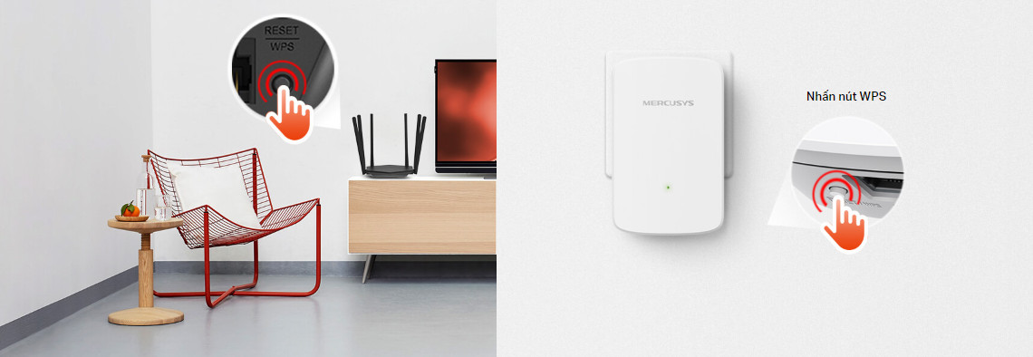 Nhấn nút WPS trên router và nút WPS trên bộ mở rộng để mở rộng phạm vi phủ sóng WiFi của bạn trong vài giây.