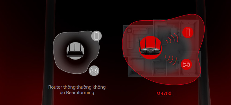 Bốn ăng ten với độ lợi cao mạnh mẽ được trang bị công nghệ Wi-Fi tiên tiến cung cấp tín hiệu mạnh mẽ xuyên suốt trong nhà bạn. Beamforming phát hiện các thiết bị được kết nối và tập trung tín hiệu Wi-Fi mạnh mẽ về phía các thiết bị đó, giúp các kết nối ổn định hơn.