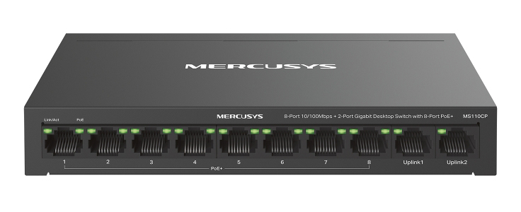 MS110CP là Switch để bàn Gigabit 8 cổng 10/100 Mbps + 2 cổng với 8 cổng PoE+, lý tưởng cho giám sát IP doanh nghiệp vừa và nhỏ với ngân sách PoE 65 W. Thiết kế cắm và chạy giúp dễ dàng triển khai mà không cần đến kỹ thuật viên.