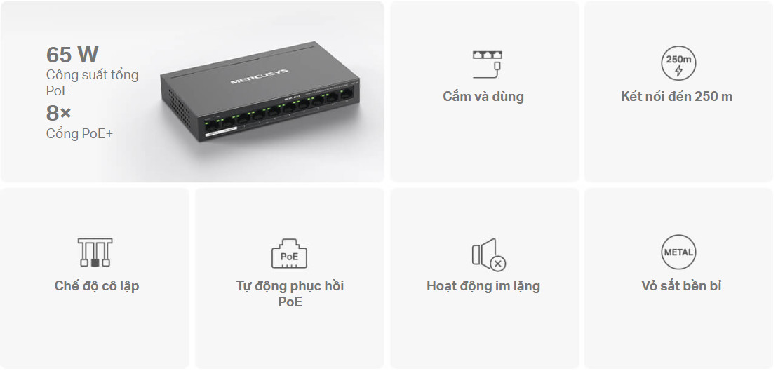 8 Cổng PoE+ (Tổng công suất 65 W) để triển khai hệ thống mạng