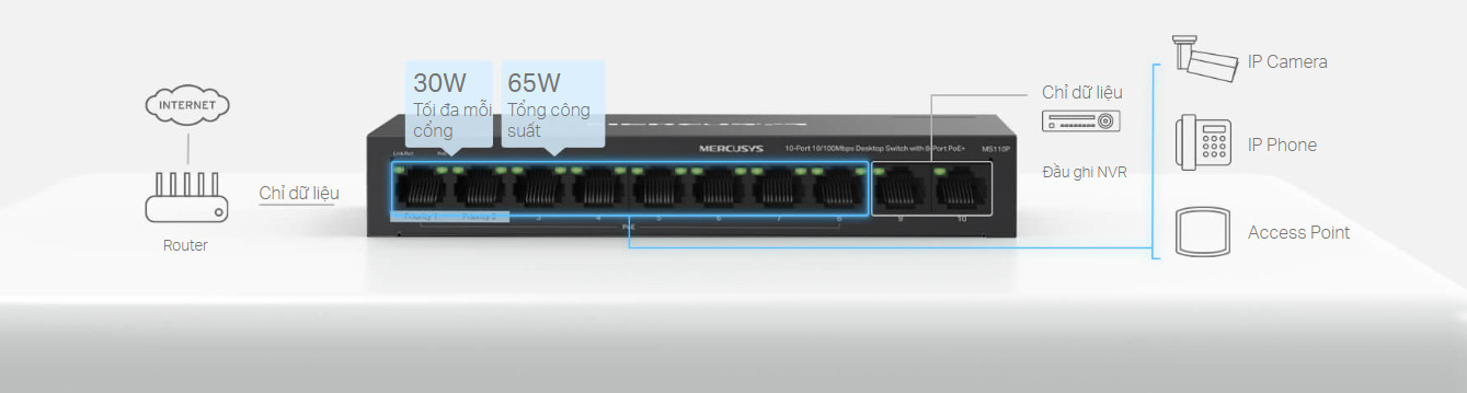 10 Cổng: 10× Cổng RJ45 10/100 Mbps với 8 cổng PoE+