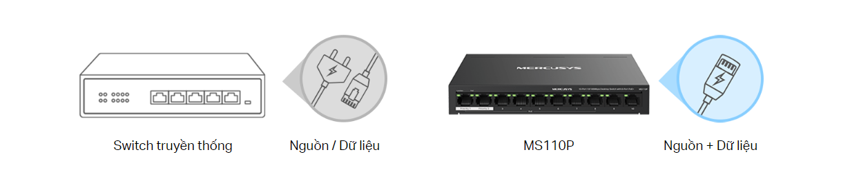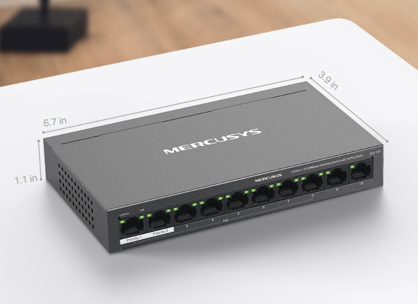 Cổng 1-8 hỗ trợ PoE+, và mỗi cổng hỗ trợ công suất tối đa 30W, tương thích chuẩn 802.3 af/at. MS110P cung cấp 2 cổng uplink, một để kết nối internet và một để kết nối với NVR. Công suất PoE tổng 65W* cho 8 cổng PoE+ giúp đa dạng mục đích sử dụng cho văn phòng, ký túc xá và doanh nghiệp nhỏ. IP cameras, access points, IP phones, PCs, đầu ghi hình, và nhiều thiết bị khác đều hoàn toàn tương thích.