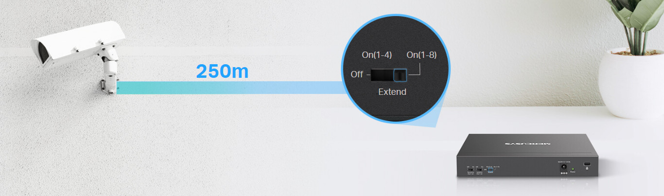 Chế độ mở rộng ** tăng khoảng cách truyền PoE lên đến 250m. MS110P có 8 cổng PoE+ hỗ trợ chế độ này. Kích hoạt chế độ mở rộng và giải quyết việc lắp đặt hệ thống camera trên khu vực rộng lớn