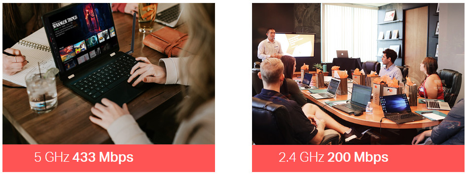 MU6H nhận tín hiệu Wi-Fi trên hai băng tần riêng biệt. Hỗ trợ công nghệ 256-QAM tăng tốc độ dữ liệu ở băng tần 2.4 GHz từ 150 Mbps đến 200 Mbps, tăng hiệu suất nhanh hơn 33%. Chọn băng tần 2.4 GHz để lướt web và media, và băng tần 5 GHz lên tới 433 Mbps để xem HD và chơi game không mượt mà hơn.