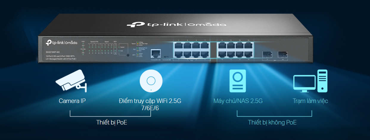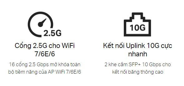 - Cổng 2.5G cho WiFi 7/6E/6 : 8 cổng PoE + 2,5 Gbps và 8 cổng không PoE 2,5 Gbps phá vỡ rào cản 2.5G và mở khóa toàn bộ tiềm năng của AP WiFi 7/6E/6.