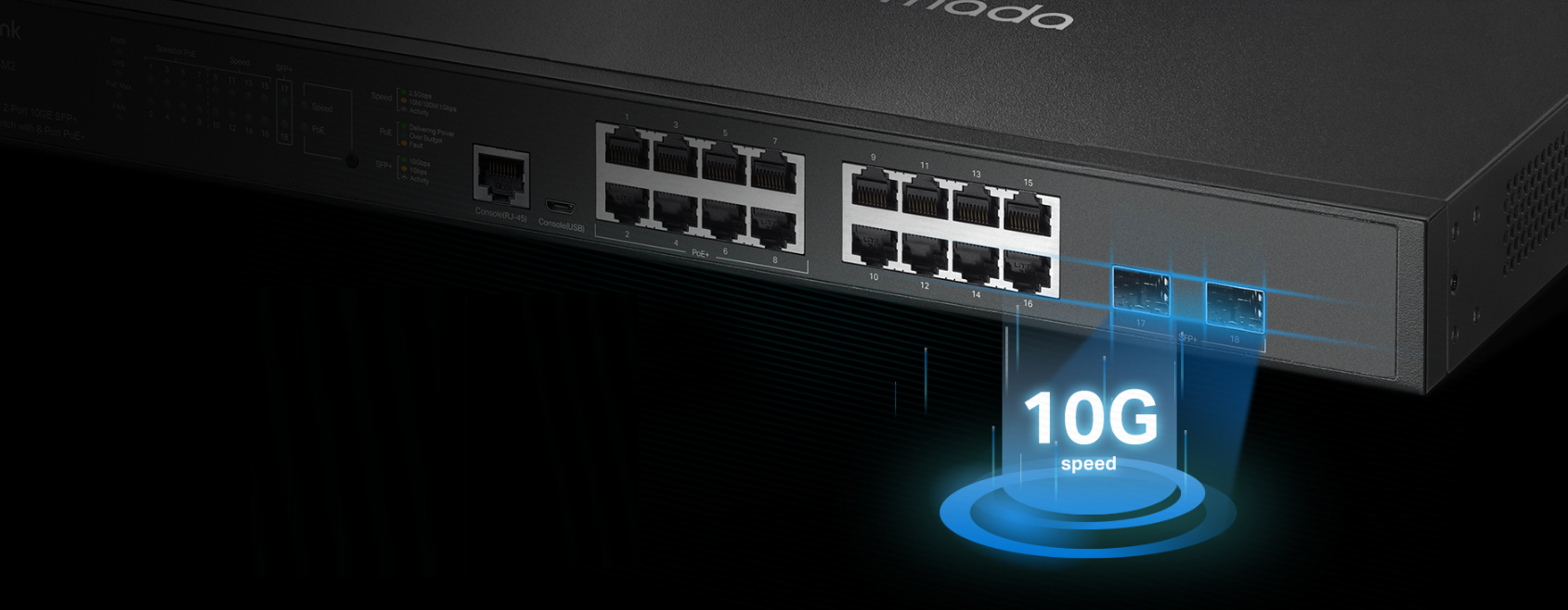 2 khe cắm SFP+ 10 Gbps cung cấp hiệu suất chuyển mạch không chặn và độ trễ cực thấp, do đó dễ dàng xây dựng kết nối đáng tin cậy và nhanh như chớp tới máy chủ và các bộ chuyển mạch khác.