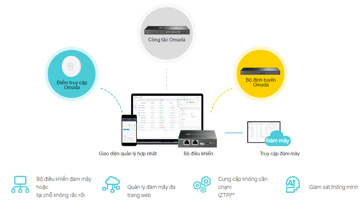 - Được tích hợp vào Omada SDN : Cung cấp không cần chạm (ZTP)**, Quản lý đám mây tập trung và Giám sát thông minh.