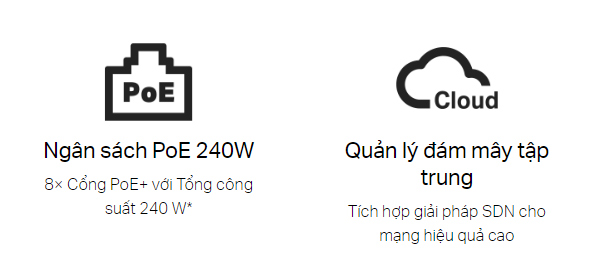 - Ngân sách PoE 240 W : 8 cổng PoE + tương thích với chuẩn 802.3at/ af với tổng công suất cung cấp là 240 W*.