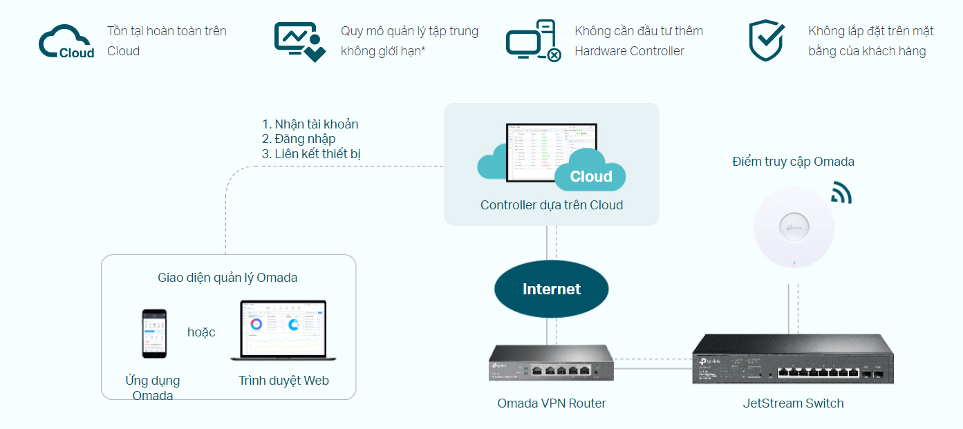 Bộ điều khiển dựa trên Cloud Omada, tồn tại hoàn toàn trên cloud cho nền tảng Omada Software Defined Networking (SDN), cung cấp khả năng quản lý cloud tập trung 100% đối với các điểm truy cập, switch và gateway & mdash; tất cả đều được điều khiển từ một giao diện duy nhất. Không cần đầu tư thêm hardware controller và cài đặt tại cơ sở của khách hàng.