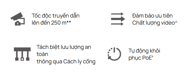**Tốc độ của các cổng hỗ trợ truyền PoE ở khoảng cách 250m sẽ bị giảm xuống còn 10 Mbps. Khoảng cách truyền thực tế có thể thay đổi tùy thuộc vào chất lượng của dây cáp.