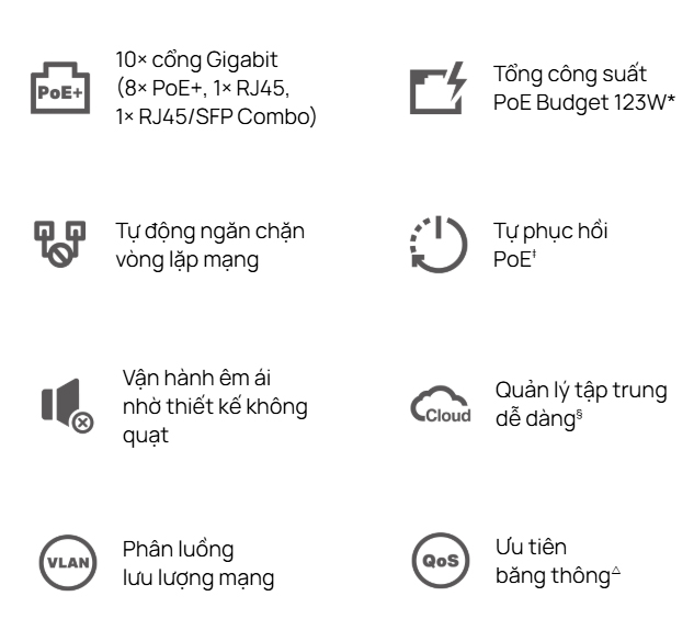 ‡Switch hỗ trợ PoE Auto Recovery ở chế độ Standalone Mode (được quản lý riêng biệt mà không cần controller) và hỗ trợ PoE Recovery thủ công ở chế độ Controller Mode (được quản lý tập trung bởi cotroller).