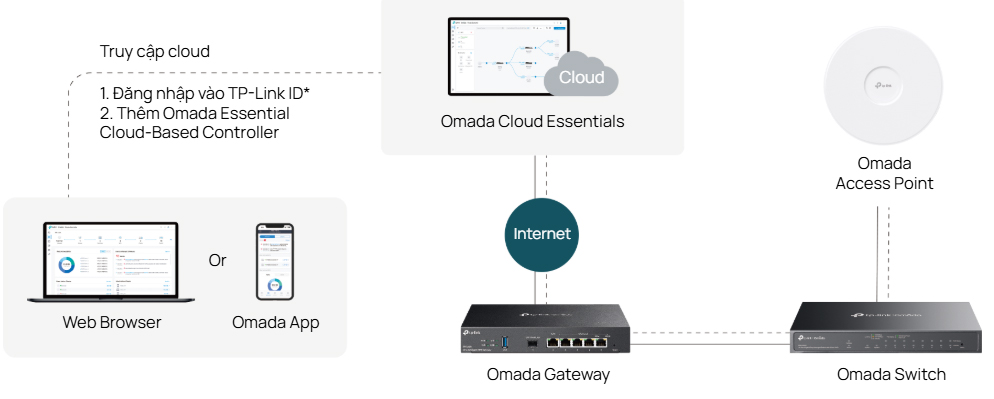 Omada Cloud Essentials là một tùy chọn quản lý dựa trên đám mây miễn phí, dễ sử dụng cho hệ thống mạng Omada, bao gồm các access point, switch và gateway. Tính năng này cho phép quản lý và giám sát mạng một cách đơn giản và tập trung với các chức năng cần thiết, phù hợp cho các hệ thống giám sát mạng và các doanh nghiệp nhỏ không yêu cầu sự phức tạp của các hoạt động quy mô lớn.
