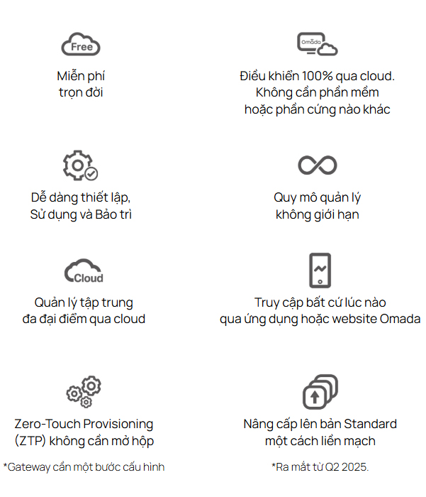 †Các chức năng này yêu cầu sử dụng Omada SDN Controller. Tính năng Zero-Touch Provisioning yêu cầu sử dụng Omada Cloud-Based Controller. Truy cập vào Omada Cloud-Based Controller Product List để tìm tất cả các model được hỗ trợ bởi Omada Cloud-Based Controller.