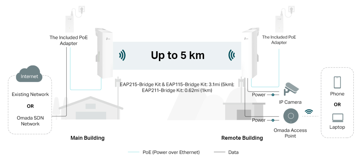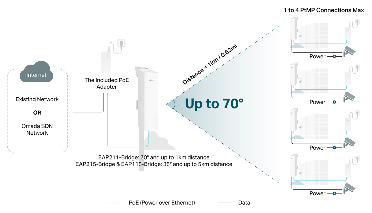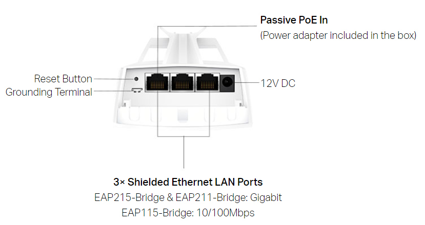 Cung cấp băng thông 550Mbps trong phạm vi 328ft (100m) bằng cách sử dụng EAP215-Bridge KIT hoặc EAP211-Bridge KIT.*