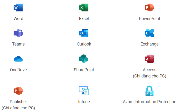 Ứng dụng chỉ có trên PC: Access, Publisher |