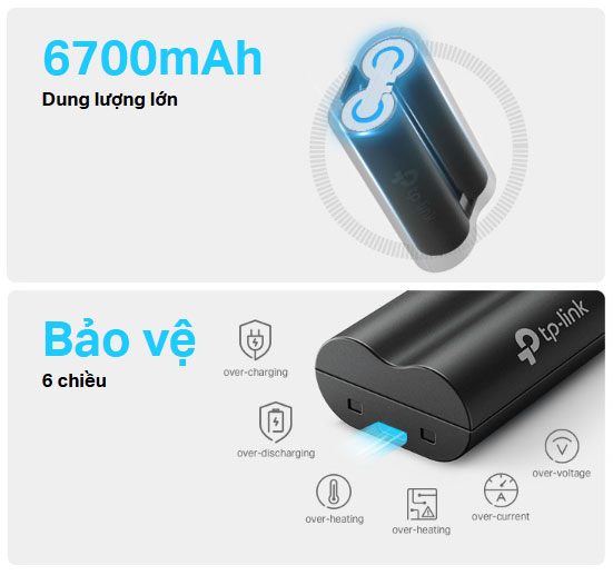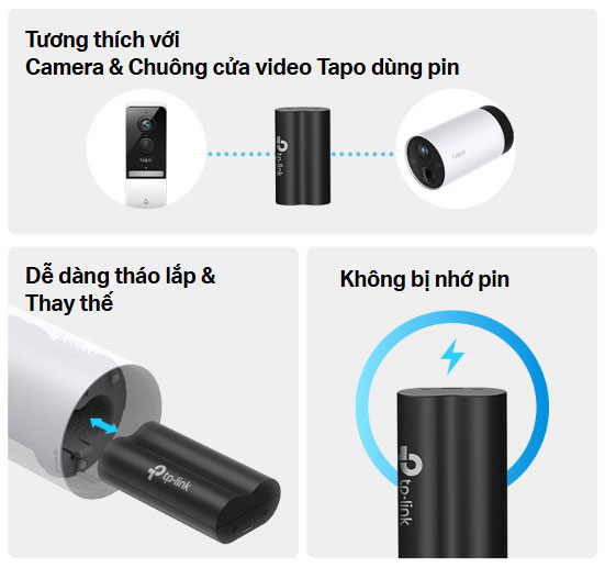 - Dung lượng lớn 6700mAh – Kéo dài thời gian sử dụng (lên đến 180 ngày)† cho các camera và chuông cửa video dùng pin Tapo.