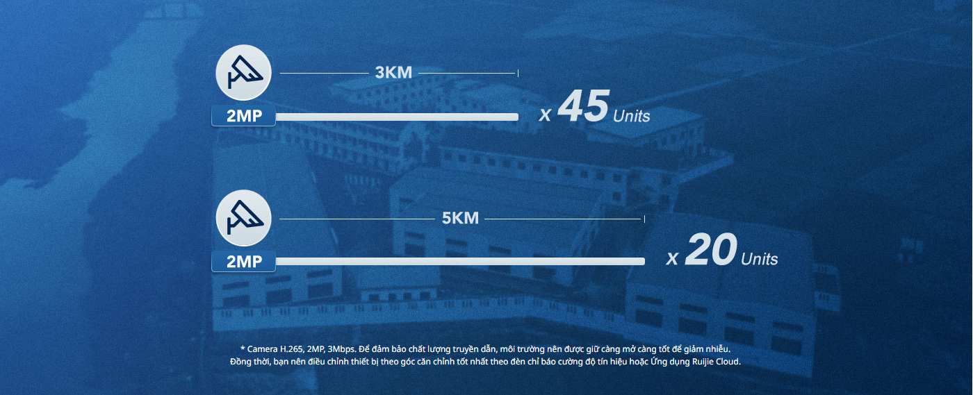 Bộ thu phát sóng không dây RUIJIE RG-EST350 V2 có thể truyền tối đa 45 camera ở 3km. Hoặc đến 20 camera tối đa ở 5km. Đối với những camera có máy ảnh H.265, 2MP, 3 Mbps. Để có thể đảm bảo được chất lượng của đường truyền, môi trường truyền cũng giữ càng thoáng càng tốt. Và đồng thời cùng điều chỉnh ở góc căn chỉnh tốt nhất bằng đèn báo cường độ tín hiệu.
