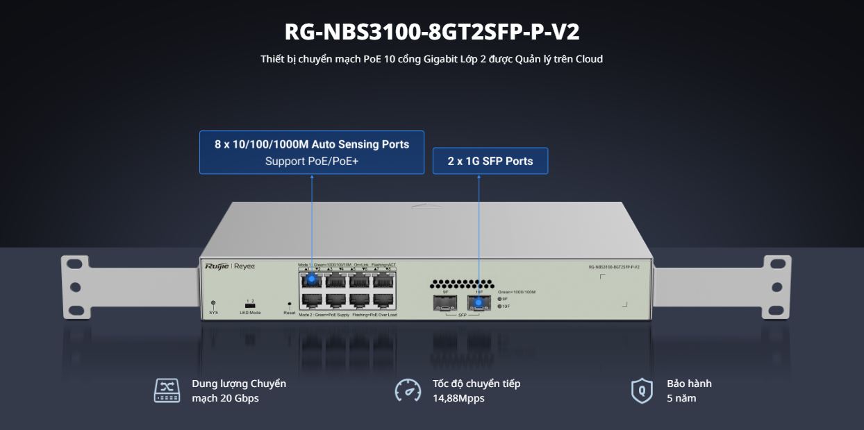 Switch Layer 2 Reyee RG-NBS3100-8GT2SFP-P-V2 8 cổng 10/100/1000BASE-T, tốc độ 20 Gbps