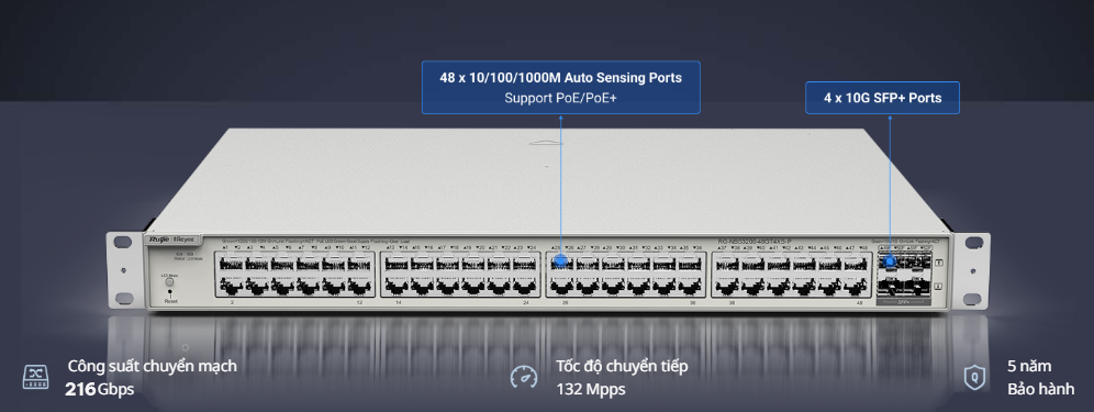Công suất chuyển mạch 216 Gbps | Tốc độ chuyển tiếp 132Mpps | Bảo hành 5 năm
