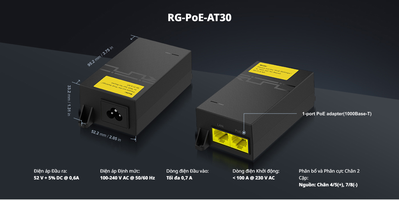Nguồn PoE adapter 52V chuẩn AT 30W Ruijie RG-POE-AT30 Công suất 31.2W, 1000Base-T