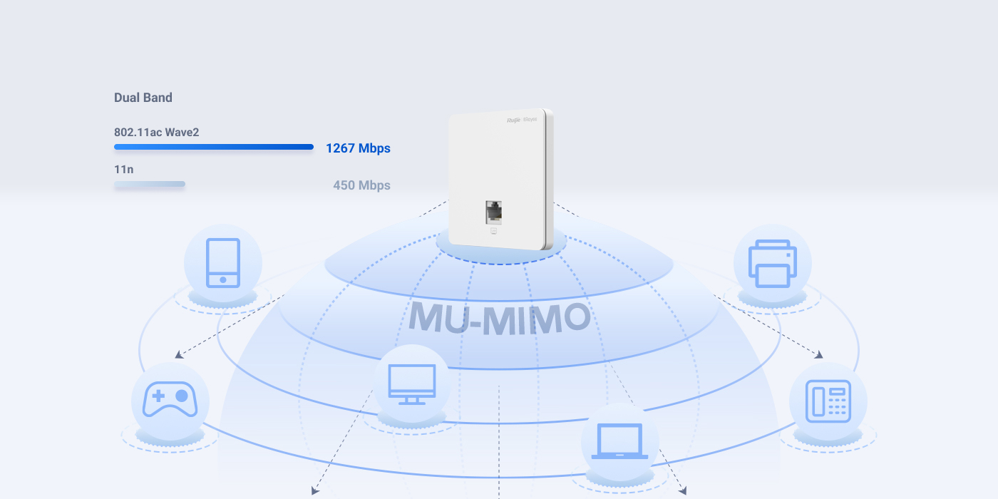 Thiết bị phát wifi âm tường RUIJIE RG-RAP1200(F) (Dual Band Ceiling Mount Access Point, Qualcomm) hỗ trợ giao tiếp băng tần kép 2.4GHz và 5GHz, cung cấp tốc độ truy cập 400Mbps ở 2.4GHz, 867Mbps ở 5GHz và lên đến 1267Mbps trên mỗi AP. Nó có thể cung cấp dải tần 5GHz với ít nhiễu hơn, kênh rộng hơn và tốc độ nhanh hơn cho các thiết bị đầu cuối, cho phép người dùng tận hưởng trải nghiệm không dây tuyệt vời.