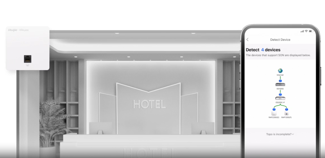 Dễ dàng thiết lập toàn bộ mạng Wi-Fi với công nghệ SON (Mạng tự tổ chức) thông qua ứng dụng Ruijie Cloud.