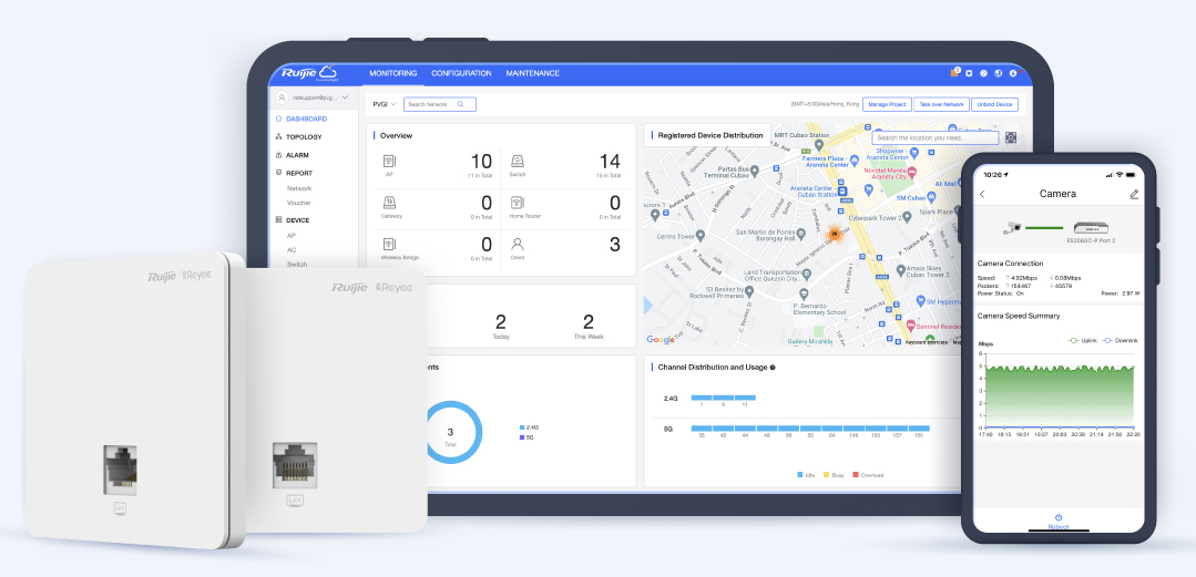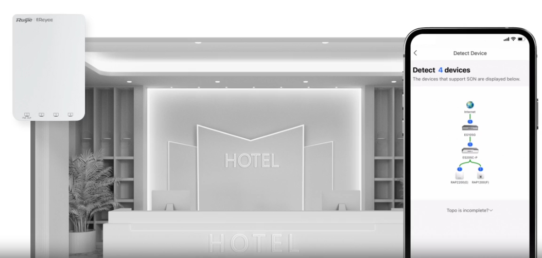 Dễ dàng thiết lập toàn bộ mạng Wi-Fi với công nghệ SON (Mạng tự tổ chức) thông qua ứng dụng Ruijie Cloud.