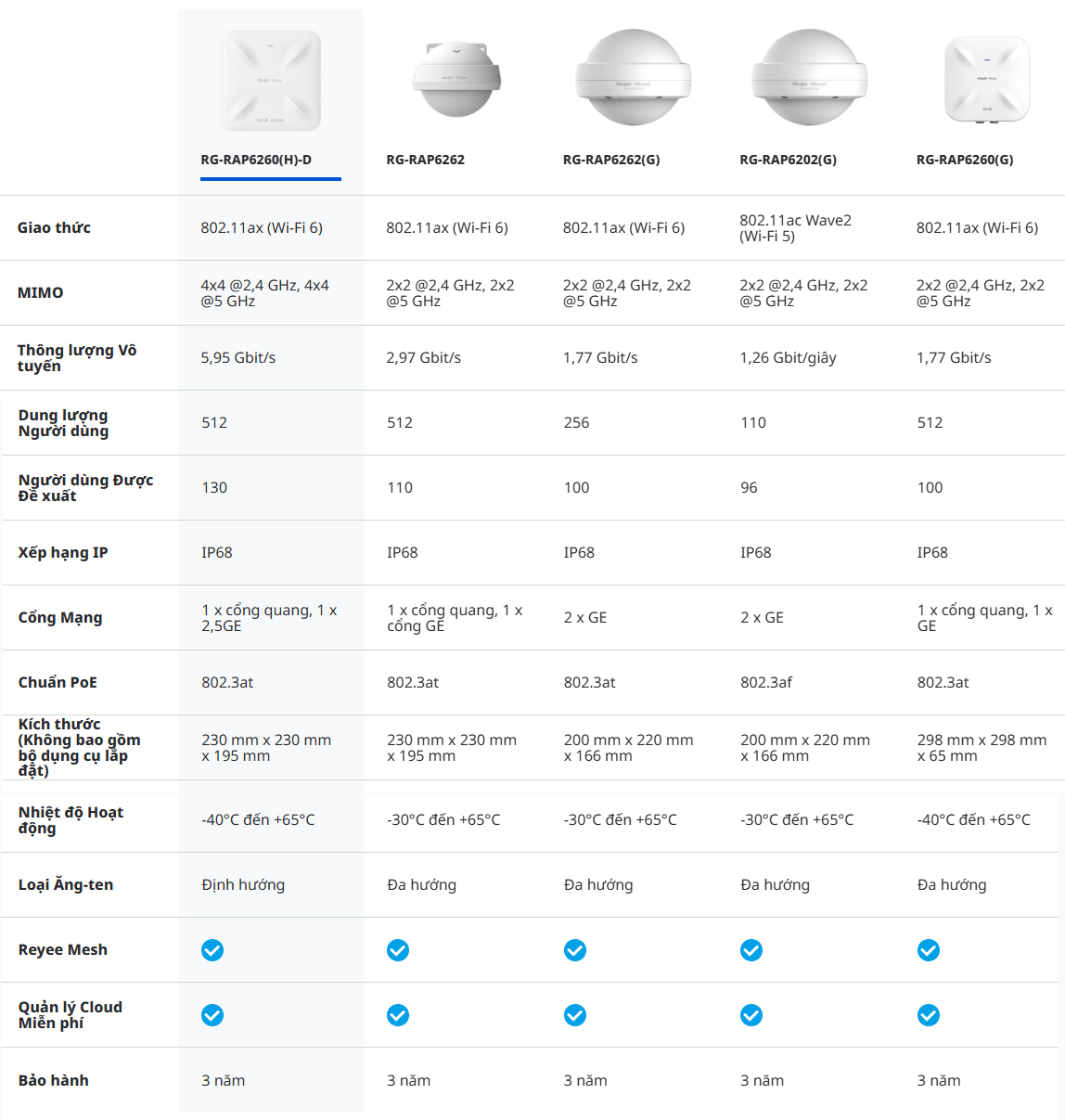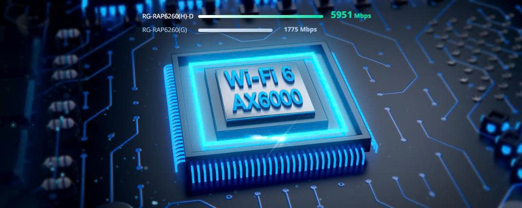Với sự kết hợp mang tính cách mạng của OFDMA và 1024QAM, chuẩn 802.11ax , băng tần 160MHz, và băng tần kép 4x4 MU-MIMO, RG-RAP6260 (H) mang lại tốc độ cao lên đến 5,95 Gbit/s.