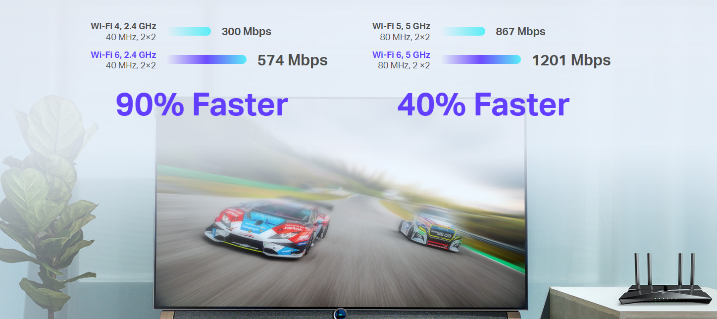 Mọi ứng dụng đều mượt mà hơn với tốc độ Wi-Fi được cải thiện đáng kể. Cả băng tần 2,4 GHz và băng tần 5 GHz đều được nâng cấp lên thế hệ mới nhất—hoàn hảo cho phát trực tuyến 4K, chơi game trực tuyến và tải xuống nhanh.