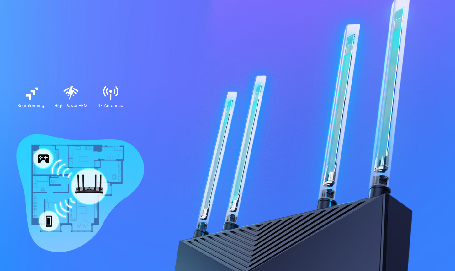 Công nghệ Beamforming, mô-đun Front-End công suất cao và bốn ăng-ten thu sóng cao kết hợp để điều chỉnh phạm vi phủ sóng Wi-Fi sao cho phù hợp hoàn hảo với ngôi nhà của bạn và tập trung cường độ tín hiệu vào các thiết bị của bạn.