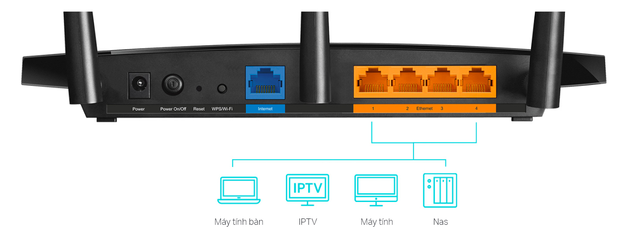 Cổng Gigabit Ethernet (1 WAN + 4 LAN) cung cấp tốc độ kết nối dây cực nhanh. Máy tính, Ti Vi thông minh và máy chơi game console của bạn sẽ hoạt động ở hiệu suất cao nhất có thể.