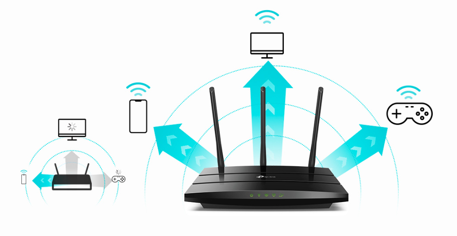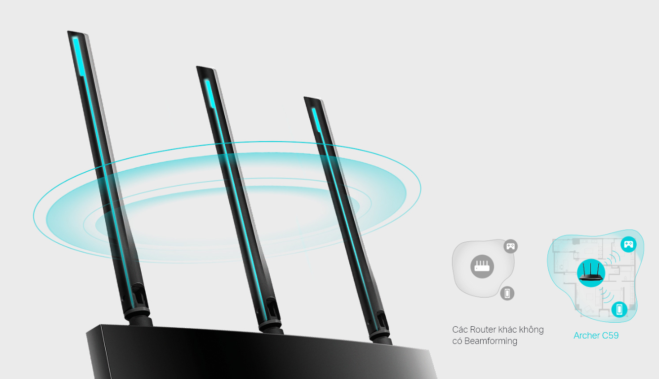 Ba ăng ten ngoài và một ăng ten ngầm truyền tín hiệu Wi-Fi mạnh mẽ đến mọi góc trong nhà bạn. Công nghệ Beamforming phát hiện các thiết bị kết nối, ngay cả khi chúng ở xa hoặc có công suất thấp và tập trung cường độ tín hiệu Wi-Fi về phía chúng.