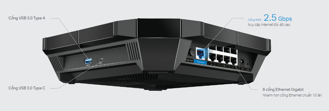 - Kết nối tốc độ cao - 1 cổng WAN 2.5 Gbps , 8 cổng LAN Gigabit, và 2 cổng USB 3.0 Type A và Type C