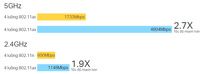 * Các tuyên bố về công nghệ Wi-Fi 802.11ax dựa trên các so sánh của tốc độ truyền tải dữ liệu lý thuyết tối đa trên một luồng sử dụng công nghệ 802.11ax ở 160MHz (1201Mbps) so với tốc độ truyền tải dữ liệu lý thuyết tối đa trên một luồng sử dụng công nghệ 802.11ac ở 80MHz (433Mbps) được ghi lại trong bảng thông số kỹ thuật chuẩn Wi-Fi IEEE 802.11ax 3.0 và IEEE 802.11-2016.