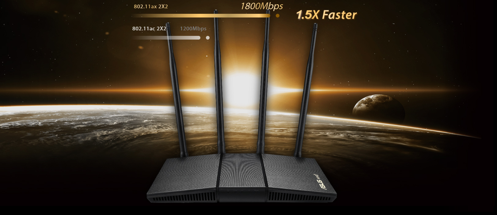 RT-AX1800HP là WiFi router hai băng tần 2x2 cung cấp băng thông 80MHz và 1024-QAM cho kết nối không dây nhanh hơn rõ rệt. Với tổng tốc độ mạng khoảng 1800Mbps - 574Mbps trên băng tần 2.4GHz và 1201Mbps trên băng tần 5GHz - router RT-AX1800HP nhanh hơn 1,5 lần so với các router hai băng tần 2x2 chuẩn 802.11ac.