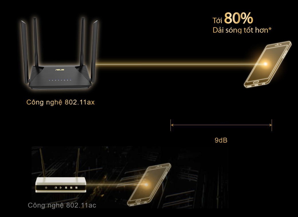 Với chuẩn WiFi 802.11ax mới nhất được trang bị công nghệ OFDMA, RT-AX53U cho dải tín hiệu WiFi cao hơn và vùng phủ sóng lớn hơn bằng cách chia từng kênh thành các kênh phụ. Những kênh phụ này có băng thông nhỏ hơn giúp chúng đi xa hơn 80%1, đảm bảo kết nối WiFi tốt hơn trong toàn bộ căn nhà của bạn*.