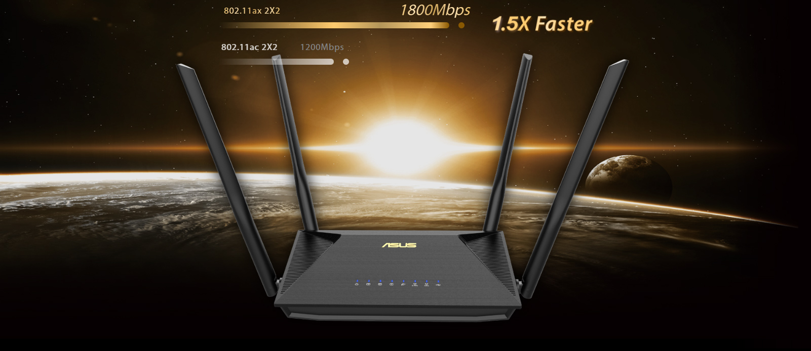 RT-AX53U là router WiFi hai băng tần 2x2 cung cấp băng thông 80MHz và 1024-QAM cho kết nối không dây nhanh hơn đáng kể. Với tổng tốc độ mạng gần 1800Mbps - 574Mbps trên băng tần 2.4GHz và 1201Mbps trên băng tần 5GHz - RT-AX53U nhanh hơn 1,5 lần so với các bộ định tuyến băng tần kép 802.11ac 2x2.