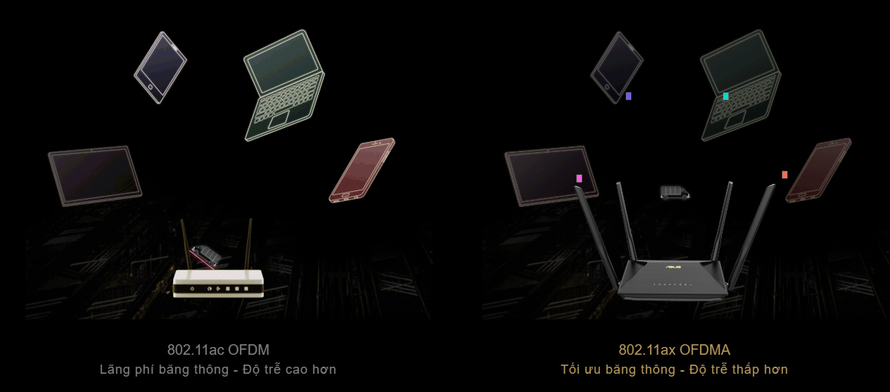 Với sự kết hợp đột phá giữa công nghệ OFDMA và MU-MIMO, công nghệ 802.11ax cung cấp dung lượng mạng lớn hơn gấp 4 lần và hiệu quả hơn trong môi trường có lưu lượng truy cập dày đặc. WiFi 802.11ac thế hệ trước chỉ có thể xử lý một thiết bị tại mỗi thời điểm trên mỗi kênh mạng nên không tận dụng được dung lượng băng thông khả dụng. Chuẩn WiFi 6 hỗ trợ OFDMA chia mỗi kênh thành các kênh phụ nhỏ, cho phép các tín hiệu từ nhiều thiết bị* được kết hợp với nhau và truyền tải đồng thời, nhờ đó giảm độ trễ và mang lại trải nghiệm WiFi mượt mà hơn, nhanh nhạy hơn.