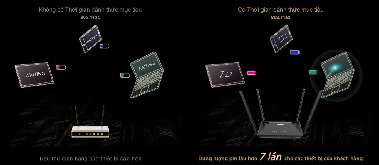 Thời gian đánh thức mục tiêu (TWT) cho phép RT-AX53U thiết lập các khoảng thời gian chỉ định cho các thiết bị phát dữ liệu. Điều này cho phép các thiết bị vào chế độ ngủ khi không cần tín hiệu bộ định tuyến, giảm được tiêu thụ điện năng tới 7 lần để tăng đáng kể dung lượng pin*.