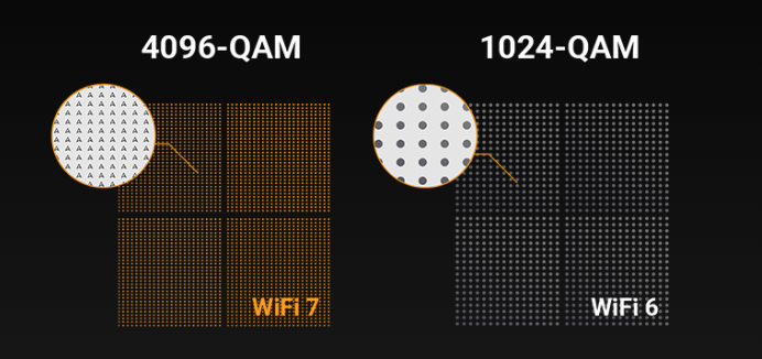 So với 1024-QAM của WiFi 6/6E, 4096-QAM (Điều chế biên độ cầu phương) cho phép mỗi tín hiệu kết hợp mật độ dữ liệu lớn hơn, mang lại hiệu năng truyền dữ liệu cao hơn tới 20%.