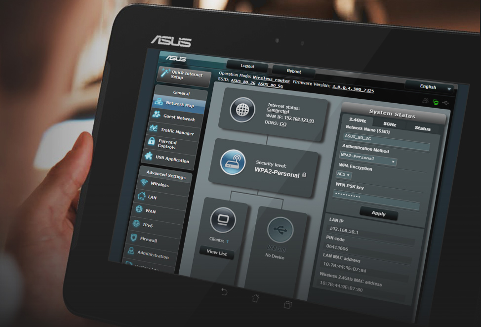 Với UI (giao diện) bảng điều khiển ASUSWRT, có thể cài đặt, theo dõi và điều khiển trực quan mọi ứng dụng mạng tại một nơi. Chỉ với 30 giây cài đặt, chức năng phát hiện đa thiết bị và các thiết lập linh hoạt, ASUSWRT sẽ khai thác tối đa hiệu suất mạng của bạn.