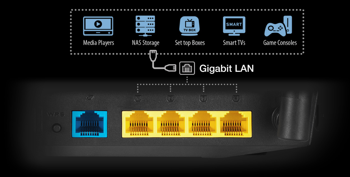 RT-AC1500UHP được trang bị bốn cổng Gigabit LAN hỗ trợ đồng thời tốc độ lên tới 4Gbps. TV thông minh, bộ điều khiển game, hộp cáp, trình phát đa phương tiện, thiết bị lưu trữ NAS và nhiều thiết bị khác hiện nay có thể có cổng chuyên dụng để biến RT-AC1500UHP thành hub đa phương tiện không giật ngay tại nhà của bạn.