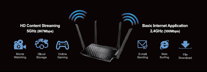Sử dụng đồng thời hai băng tần 2,4 GHz với tốc độ 300Mbps và băng tần 5 GHz với tốc độ lên đến 867Mbps, RT-AC1200 V2 có tổng tốc độ kết nối lên tới 1167Mbps, mang đến tốc độ ổn định. Thực hiện các tác vụ internet cơ bản như duyệt web và tải tệp tin bằng băng tần 2,4 GHz, đồng thời truyền phát nội dung 3D HD và các ứng dụng có yêu cầu cao khác một cách mượt mà bằng băng tần 5 GHz.