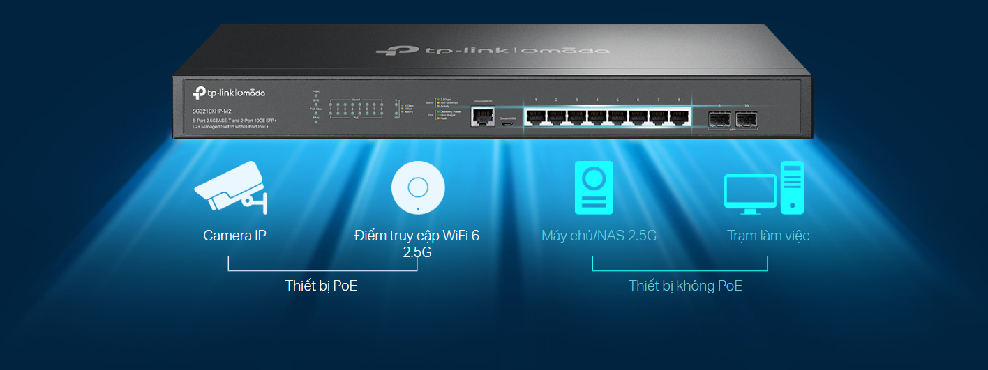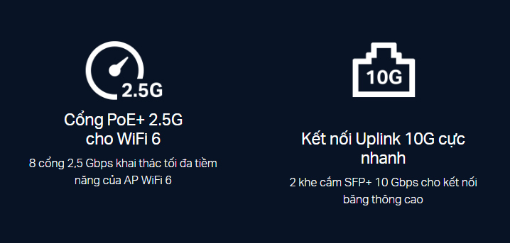 - Cổng PoE+ 2.5G cho WiFi 6: 8 cổng 2.5 Gbps phá vỡ rào cản gigabit và mở khóa toàn bộ tiềm năng của AP WiFi 6.