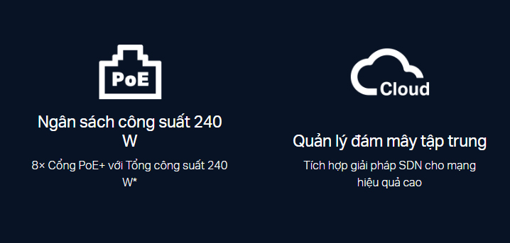- Ngân sách PoE 240 W: 8 cổng PoE+ tương thích với chuẩn 802.3at/af với tổng công suất cung cấp là 240 W*.
