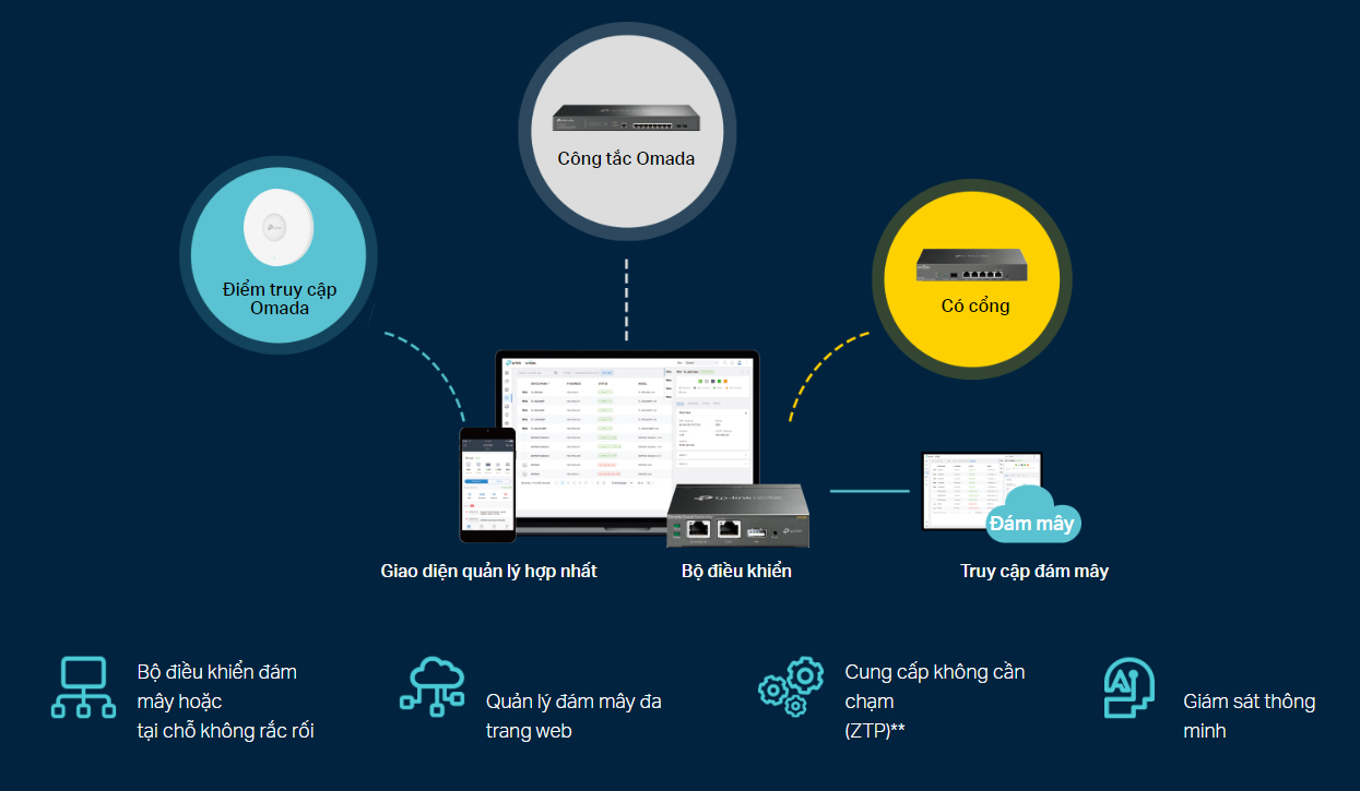 - Quản lý đám mây tập trung: Tích hợp vào Omada SDN để cung cấp Zero-Touch Provisioning (ZTP)**, truy cập đám mây, quản lý từ xa và quản lý nhiều địa điểm.