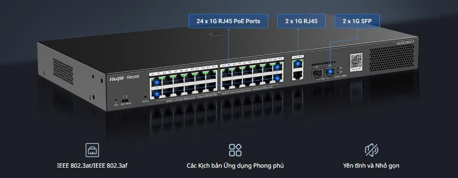 Switch PoE 28 cổng Reyee RG-ES228GS-P 24 cổng 10/100/1000M PoE/PoE+, 2 cổng uplink 1000 RJ45, PoE 370W, 56 Gbps